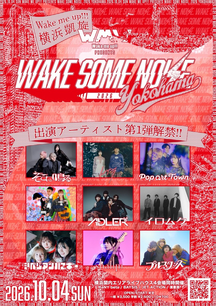 Wake me up!!! pre. WAKE SOME NOISE. 2026 YOKOHAMA SCHEDULE 2026/10/04(日) 横浜関内エリアライブハウス4会場ReNY beta / BAYSIS / JET ACTION / Music Lab.濱書房 open / start TBA w/ 共演者多数 ticket adv 一般 ¥3,500 / 学割 ¥2,500 (+1D) チケットはこちら URLをコピーする 報告する