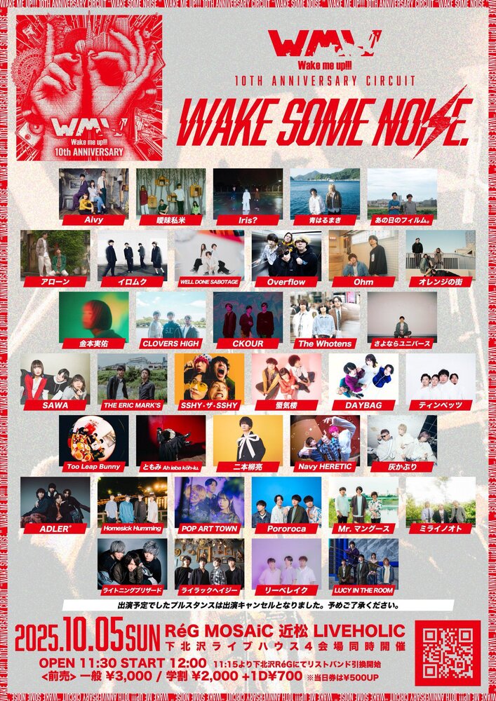Wake me up!!! 10th ANNIVERSARY CIRCUIT “ WAKE SOME NOISE. ” SCHEDULE 2025/10/05(日) 下北沢ReG / MOSAiC / 近松 / LIVEHOLIC open 11:30 / start 12:00 w/ 画像参照 ticket 一般 ¥3,000 / 学割 ¥2,500 (+1D) 物販にて手売り販売中! チケットはこちら URLをコピーする 報告する