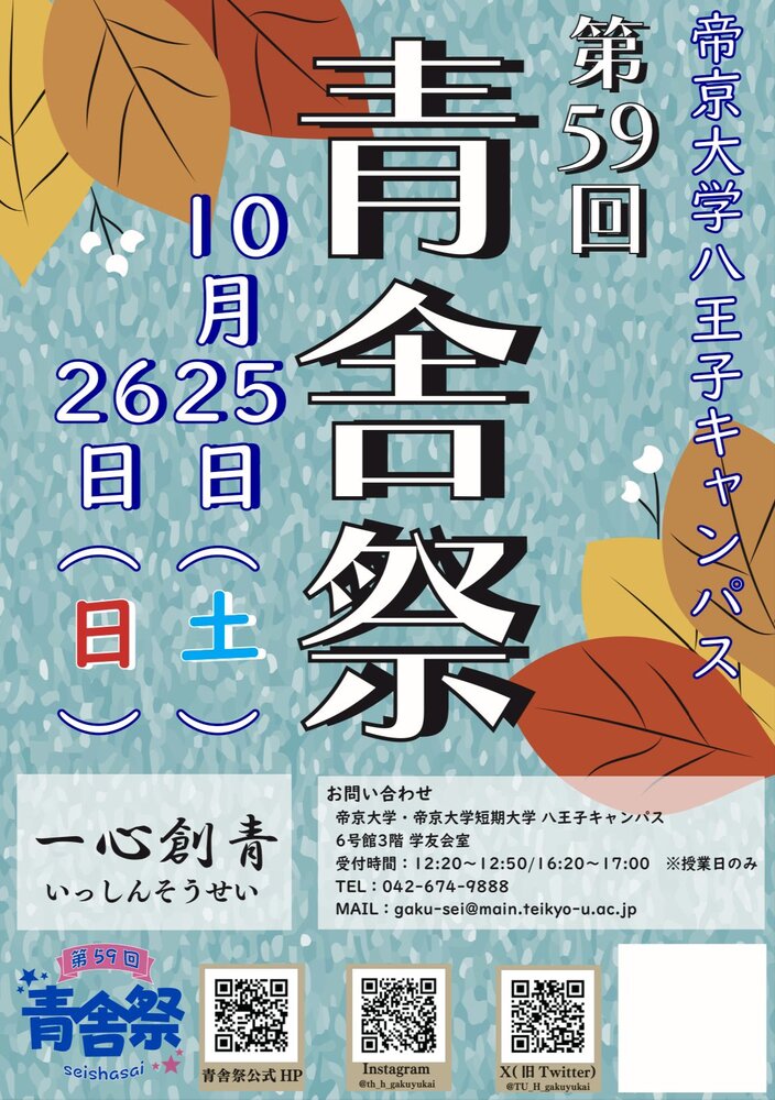 帝京大学八王子キャンパス 第59回「青舎祭」 SCHEDULE 2025/10/26(日) 帝京大学八王子キャンパス キュリオシティホール 出演時間 12:45〜13:15 ticket free URLをコピーする 報告する