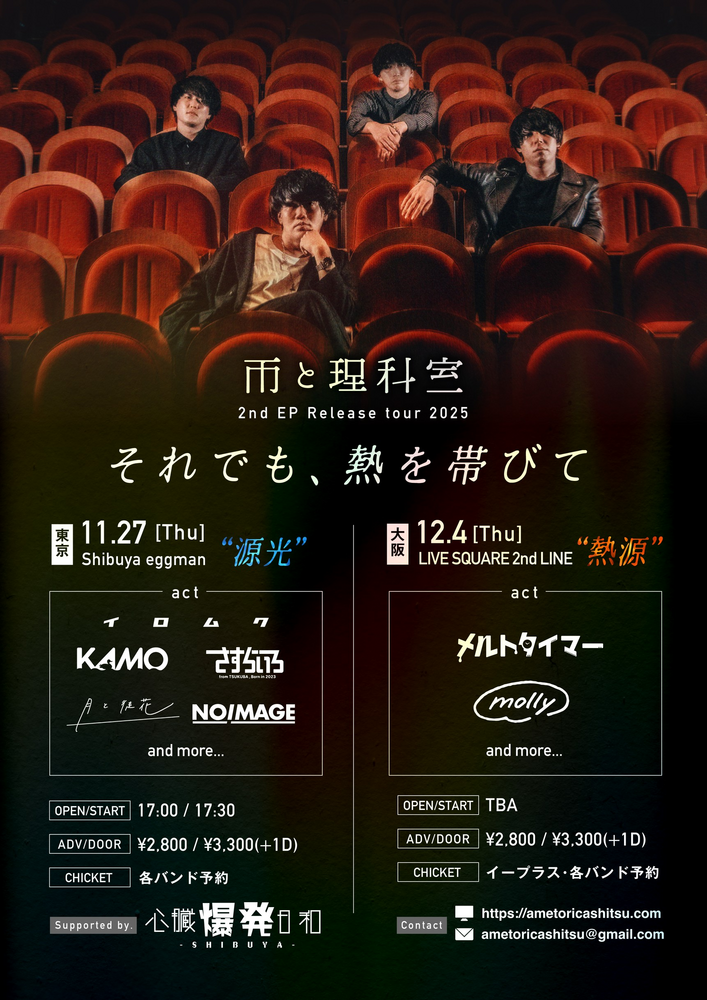 雨と理科室 2nd EP Release tour 2025「それでも、熱を帯びて」 SCHEDULE 2025/11/27(木) 渋谷eggman open 17:00 / start 17:30 w/ 雨と理科室 / KAMO / さすらいろ / 月と徒花 / NOIMAGE and more... ticket adv ¥2,800 / door ¥3,300 (+1D) チケットはこちら URLをコピーする 報告する