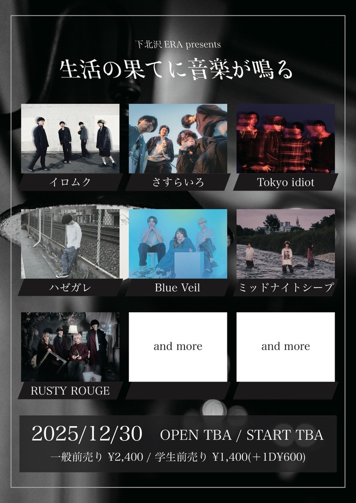 下北沢ERA pre. 「生活の果てに音楽が鳴る」 SCHEDULE 2025/12/30(火) 下北沢ERA open / start TBA w/ さすらいろ / Tokyo idiot / ハゼガレ / Blue Veil / ミッドナイトシープ / RUSTY ROUGE and more... ticket adv ¥2,400 / door ¥2,900 / 学割 ¥1,400 (+1D) チケットはこちら URLをコピーする 報告する