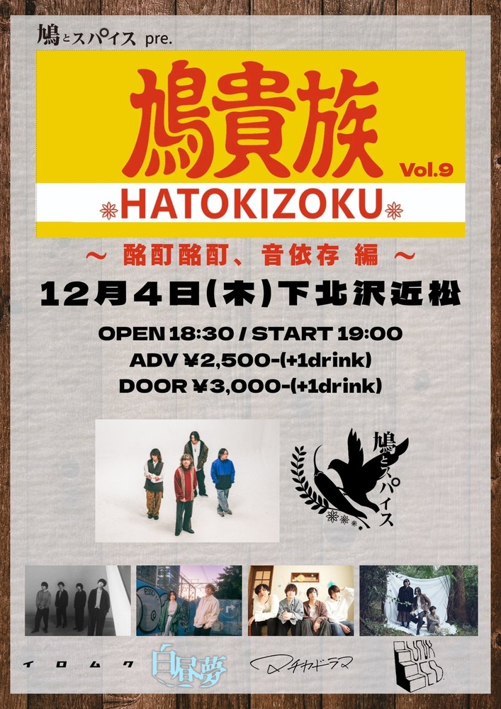 鳩とスパイス pre. 「鳩貴族 vol.9」 〜酩酊酩酊、音依存 編〜 SCHEDULE 2025/12/04(木) 下北沢近松 open 18:30 / start 19:00 w/ 鳩とスパイス / 白昼夢 / マチカドラマ / Bunk Bed ticket adv ¥2,500 / door ¥3,000 (+1D) チケットはこちら URLをコピーする 報告する