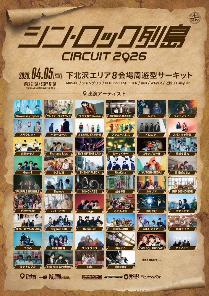 シン‧ロック列島 CIRCUIT 2026 SCHEDULE 2026/04/05(日) 下北沢ライブハウス8会場 open 11:30 / start 12:00 w/ 共演者多数 ticket ¥5,000 (+1D) チケットはこちら URLをコピーする 報告する