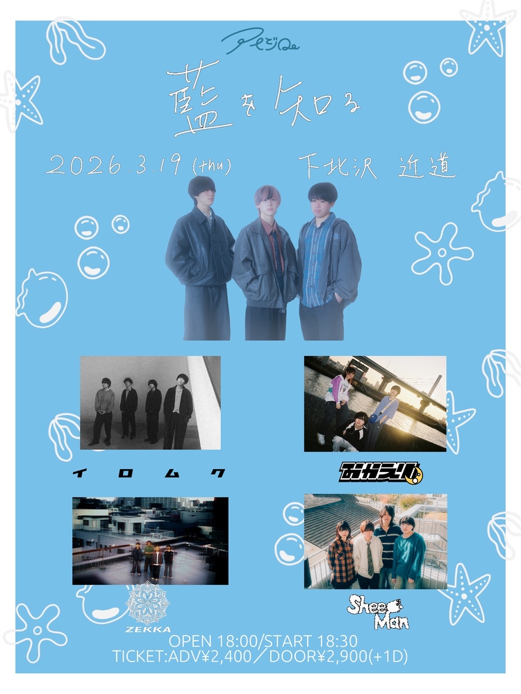 アイジロ。 pre 「藍を知る」 SCHEDULE 2026/03/19(木) 下北沢近道 open 18:00 / start 18:30 w/ アイジロ。/ おかえり / ゼッカ / Sheep Man ticket adv ¥2,400 / door ¥2,900 (+1D) チケットはこちら URLをコピーする 報告する