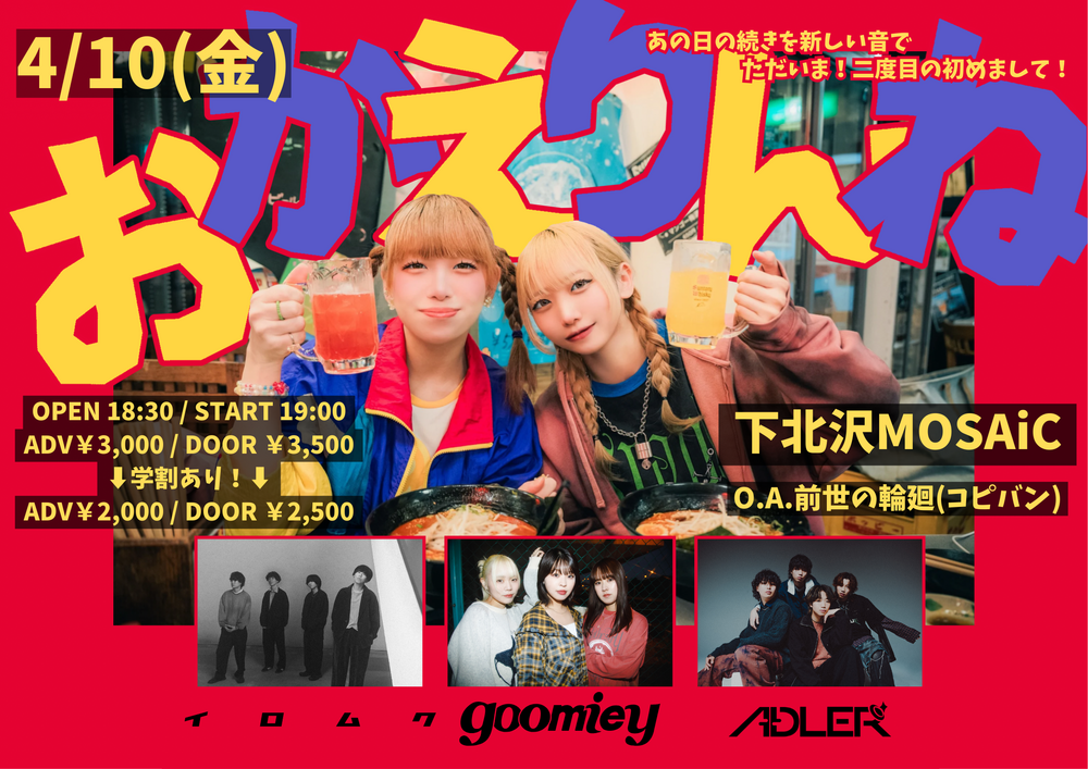 輪廻 pre. 「おかえりんね」 SCHEDULE 2026/04/10(金) 下北沢MOSAiC open 18:30 / start 19:00 w/ 輪廻 / goomiey / ADLER° / 前世の輪廻(OA) ticket 一般 adv ¥3,000 / door ¥3,500 / 学割 adv ¥2,000 / door ¥2,500 (+1D) チケットはこちら URLをコピーする 報告する